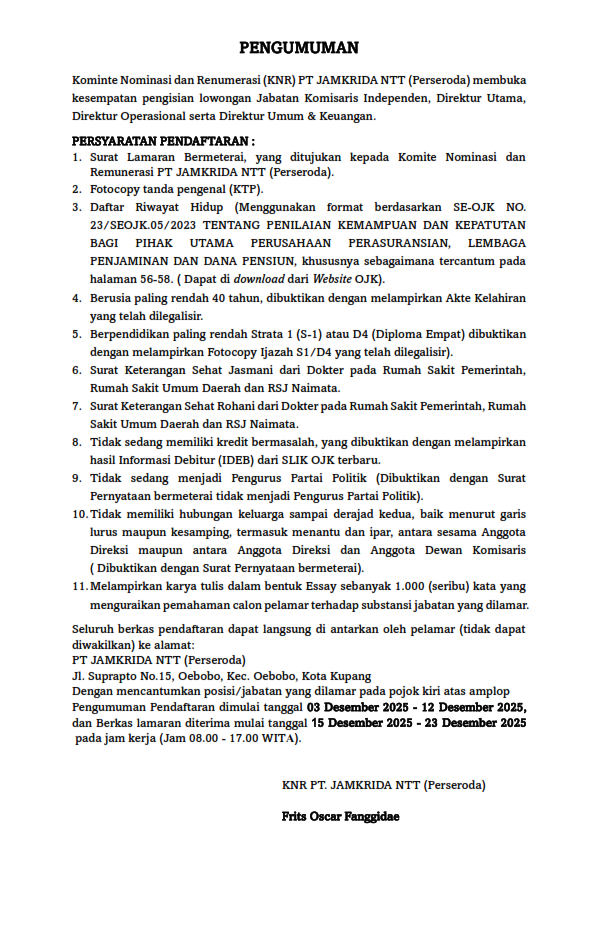 Pengumuman Penerimaan Komisaris Independen, Direktur Utama, Direktur Operasional serta Direktur Umum & Keuangan